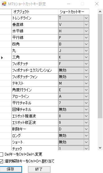 現在のバージョンでは下記のオブジェクトにキーを割り当てられます。 ------------------------------- トレンドライン アローライン 垂直線 水平線 パラレルライン 四角 フィボナッチ デリート テキスト 角度付トレンドライン 上矢印 下矢印 チェック ストップ 角度付トレンドライン フィボナッチ・エクスパンション フィボナッチ・ファン 回帰チャネル 丸 三角 エリオット推進波 エリオット修正波 平行チャネル 買サイン 売サイン 右プライス 左プライス