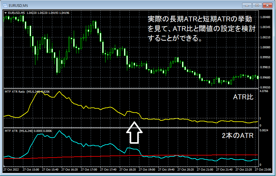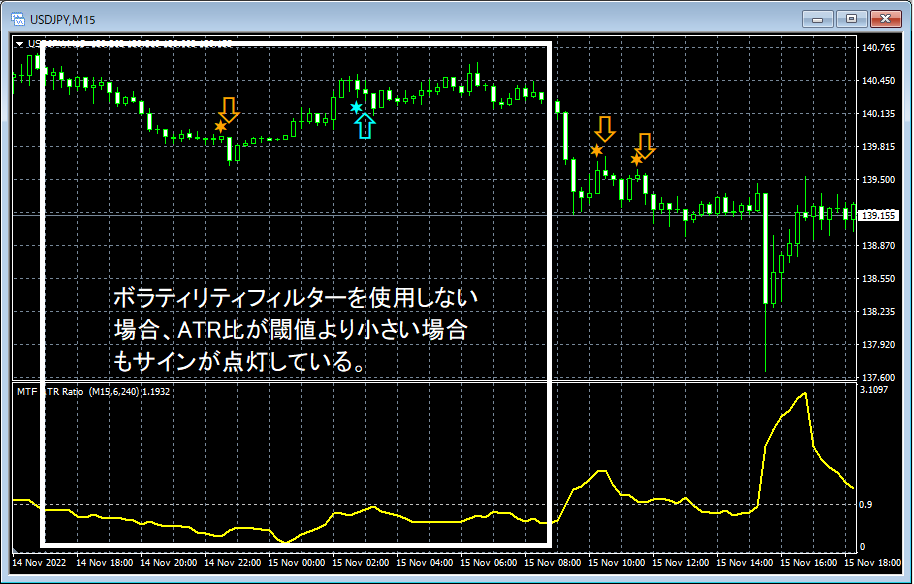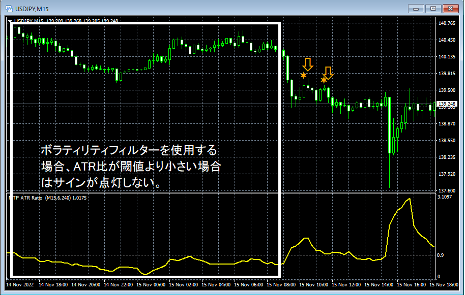 本体インジケーター【SRF2】には、ボラティリティ(値動き)の小さな相場を避けることを目的として、ATR比を使ったマルチタイムフレーム対応のボラティリティフィルターが実装されています。  ボラティリティフィルターを利用する場合、ATR比が指定した閾値(ATR_Ratio_Level)より大きい場合のみサインが点灯します。  ATR比短期ATR/長期ATR で定義される値です。  上図の項目がATR比を使ったボラティリティフィルターの設定項目となっています。  MTF(マルチタイムフレーム)に対応しています。 ATR_Filter:  ボラティリティフィルターを使用する場合には true、使用しない場合には false を選択する。 TimeFrame:  フィルターに使うATR比を計算するタイムフレームを設定します。  現在のタイムフレームと同じタイムフレームあるいはそれより上位の足(長期の足)を指定することができます。  現在のタイムフレームより下位の足(短期の足)を指定した場合は現在のタイムフレームを指定したことと同じことになります。  上図のNote1~Note4にあるように、TimeFrameの設定項目で指定できる値とタイムフレームとの対応は下記の通りです。例えば、1時間足を指定したい場合には60と入力します。   現在の足: 0   1分足:   1   5分足:   5   15分足:  15   30分足:  30   1時間足: 60   4時間足: 240   日足:  1440   週足: 10080   月足: 43200 ATR_Long_Period:  長期ATRの期間を設定します。 ATR_Short_Period:  短期ATRの期間を設定します。 ATR_Ratio_Level:  ATR比が指定した閾値(ATR_Ratio_Level)より大きい場合のみサインが点灯します。 上記の各設定項目における設定値については、ユーザ様それぞれの手法,通貨ペアやタイムフレーム,その時々における相場状況などに応じてお好みの設定でご利用下さい。 ※本商品には上記の各設定値を検討するために作成された「ATRを2本表示するインジケーター(MTF_ATR_2Lines_XXXXXXXX.ex4)」が付属しています。これについては後述します。 チャート例 ボラティリティフィルターなし (ATR_Filter = false) ボラティリティフィルターあり (ATR_Filter = true, TimeFrame = 0, ATR_Long_Period = 240, ATR_Short_Period = 6, ATR_Ratio_Level = 0.9)