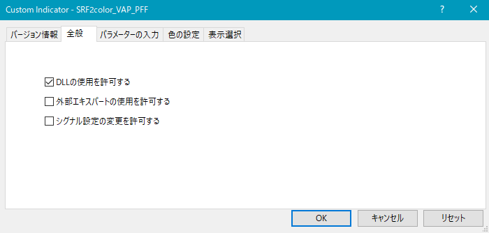 本商品には、2本のATRを表示するマルチタイムフレーム対応インジケーター MTF_ATR_2Lines_XXXXXXXX.ex4 が付属しています。  本インジケーターは、前述のボラティリティフィルターを使用する際に、2本のATRの期間の設定や閾値の設定を検討するためなどに作成したものです。 チャート例 サブウィンドウ1:MTF_ATR_Ratio サブウィンドウ2:MTF_ATR_2Lines チャート例(マルチタイムフレーム,5分足に1時間足のATRを表示した例) サブウィンドウ1:MTF_ATR_Ratio サブウィンドウ2:MTF_ATR_2Lines 設定項目について  下図の通り、"DLLの使用を許可する" にチェックを入れる必要があります。  本インジケーターは、MTF(マルチタイムフレーム)に対応しています。 TimeFrame:  表示するATR比を計算するタイムフレームを設定します。  現在のタイムフレームあるいはそれより上位の足(長期の足)を指定することができます。  現在のタイムフレームより下位の足(短期の足)を指定した場合は現在のタイムフレームを指定したことと同じことになります。  上図のNote1~Note4にあるように、TimeFrameの設定項目で指定できる値とタイムフレームとの対応は下記の通りです。例えば、1時間足を指定したい場合には60と入力します。   現在の足: 0   1分足:   1   5分足:   5   15分足:  15   30分足:  30   1時間足: 60   4時間足: 240   日足:  1440   週足: 10080   月足: 43200 ATR_Long_Period:  長期ATRの期間を設定します。 ATR_Short_Period:  短期ATRの期間を設定します。