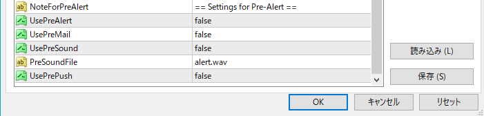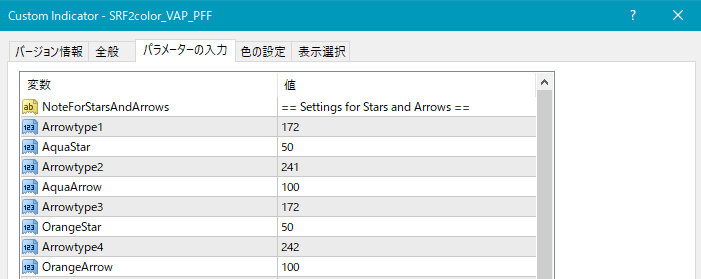 下図の通り、"DLLの使用を許可する" にチェックを入れる必要があります。 星印や矢印の表示位置や形状に関する設定項目  星印や矢印の表示位置がローソク足に近すぎて見にくかったり、逆に遠すぎて場合によっては表示位置が画面外になってしまう場合もあります。これらの印を表示する高さを、下記の設定項目の値を調整することにより、修正することができます。値が大きいほど表示位置はローソク足から離れていきます。  (初期設定では水色の)星印 → AquaStar  (初期設定では水色の)矢印 → AquaArrow  (初期設定ではオレンジ色の)星印 → OrangeStar  (初期設定ではオレンジ色の)矢印 → OrangeArrow  また、下記の項目の値を変更することにより、星印や矢印の形状を変更することができます。  (初期設定では水色の)星印 → Arrowtype1  (初期設定では水色の)矢印 → Arrowtype2  (初期設定ではオレンジ色の)星印 → Arrowtype3  (初期設定ではオレンジ色の)矢印 → Arrowtype4  なお、星印や矢印あるいはその代わりとして使用できる記号とそれに対応する番号は下表の通りです。 アラート機能に関する設定項目 (1)矢印サイン点灯時のアラートについて UseAlert:  下図のようなアラートダイアログによりサイン発生を知らせる機能を使用する場合には true、使用しない場合には false を選択する。 UseMail:  メールによりサイン発生を知らせる機能を使用する場合には true、使用しない場合には false を選択する。 UseSound:  アラート音によりサイン発生を知らせる機能を使用する場合には true、使用しない場合には false を選択する。 SoundFile:  アラート音に使うサウンドのファイル名を入力する。 UsePush:  プッシュ通知によりサイン発生を知らせる機能を使用する場合には true、使用しない場合には false を選択する。 (2)星印サイン初回点灯時のアラートについて UsePreAlert:  下図のようなアラートダイアログによりサイン発生を知らせる機能を使用する場合には true、使用しない場合には false を選択する。 UsePreMail:  メールによりサイン発生を知らせる機能を使用する場合には true、使用しない場合には false を選択する。 UsePreSound:  アラート音によりサイン発生を知らせる機能を使用する場合には true、使用しない場合には false を選択する。 PreSoundFile:  アラート音に使うサウンドのファイル名を入力する。 UsePrePush:  プッシュ通知によりサイン発生を知らせる機能を使用する場合には true、使用しない場合には false を選択する。 メールによりサイン発生を知らせる機能を使用する場合のMT4側の設定の一例 ツール → オプション → E-メール イメージ図 AlertMail-MT4Settings_Windows10_20200313.png ※設定後にMT4を再起動させる必要があるようです。