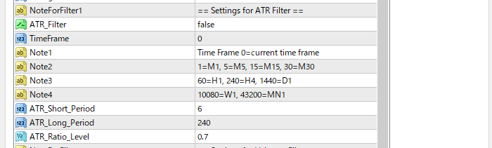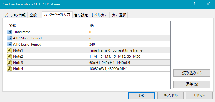 本商品には、ATR比(短期ATR/長期ATR)を表示するインジケーター MTF_ATR_Ratio_XXXXXXXX.ex4 が付属しています。 チャート例 サブウィンドウ:MTF_ATR_Ratio 設定項目について  下図の通り、"DLLの使用を許可する" にチェックを入れる必要があります。  本インジケーターは、MTF(マルチタイムフレーム)に対応しています。 TimeFrame:  表示するATR比を計算するタイムフレームを設定します。  現在のタイムフレームあるいはそれより上位の足(長期の足)を指定することができます。  現在のタイムフレームより下位の足(短期の足)を指定した場合は現在のタイムフレームを指定したことと同じことになります。  上図のNote1~Note4にあるように、TimeFrameの設定項目で指定できる値とタイムフレームとの対応は下記の通りです。例えば、1時間足を指定したい場合には60と入力します。   現在の足: 0   1分足:   1   5分足:   5   15分足:  15   30分足:  30   1時間足: 60   4時間足: 240   日足:  1440   週足: 10080   月足: 43200 ATR_Long_Period:  長期ATRの期間を設定します。 ATR_Short_Period:  短期ATRの期間を設定します。