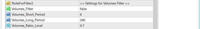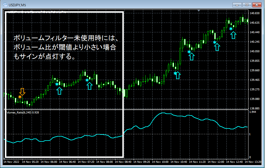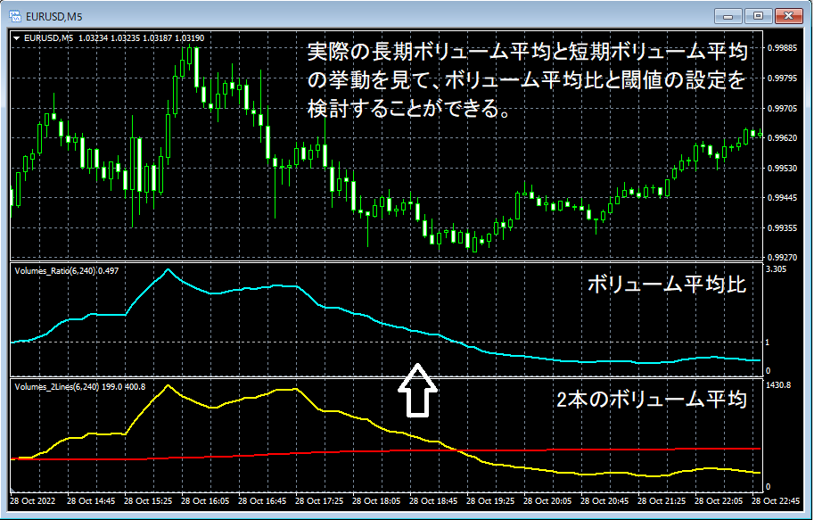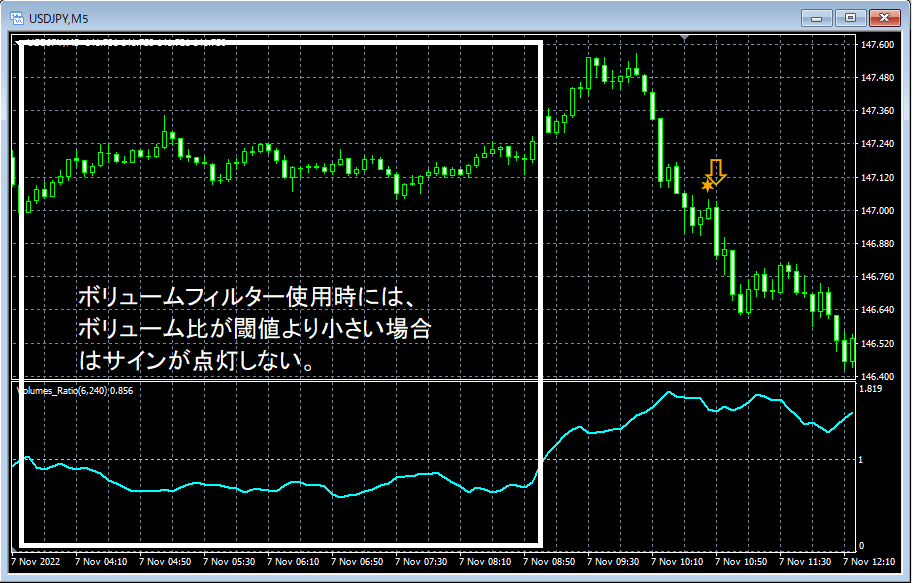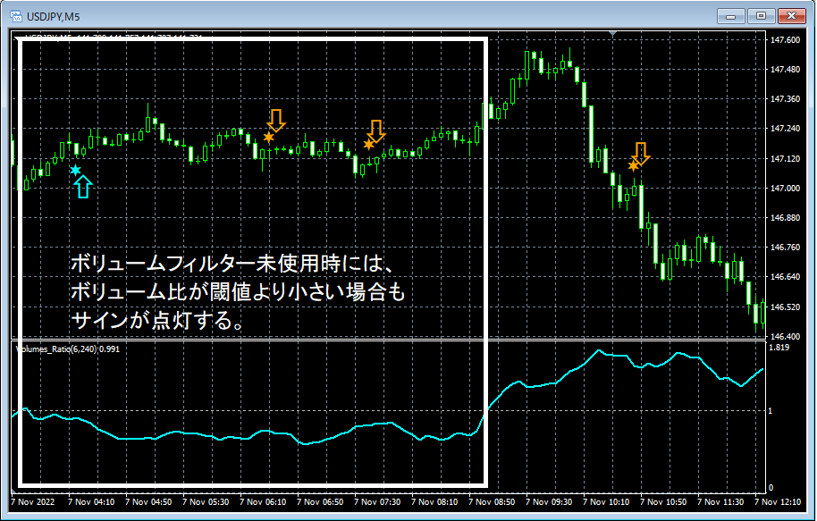 本体インジケーター【SRF2】には、ボリューム(出来高)の小さな相場を避けることを目的として、ボリューム平均比を使ったボリュームフィルターが実装されています。  ボリュームフィルターを利用する場合、ボリューム平均比が指定した閾値(Volume_Ratio_Level)より大きい場合のみサインが点灯します。  ボリューム平均比短期ボリューム平均/長期ボリューム平均 で定義される値です。  上図の項目がボリューム平均比を使ったボリュームフィルターの設定項目となっています。 Volumes_Filter:  ボラティリティフィルターを使用する場合には true、使用しない場合には false を選択する。 Volumes_Long_Period:  長期ボリューム平均の期間を設定します。 Volumes_Short_Period:  短期ボリューム平均の期間を設定します。 Volumes_Ratio_Level:  ボリューム平均比が指定した閾値(Volumes_Ratio_Level)より大きい場合のみサインが点灯します。 上記の各設定項目における設定値については、ユーザ様それぞれの手法,通貨ペアやタイムフレーム,その時々における相場状況などに応じてお好みの設定でご利用下さい。 ※本商品には上記の各設定値を検討するために作成された「ボリューム平均を2本表示するインジケーター(Volume_2Lines_XXXXXXXX.ex4)」が付属しています。これについては後述します。 チャート例 ボラティリティフィルターなし (Volumes_Filter = false) ボラティリティフィルターあり (Volumes_Filter = true, Volumes_Long_Period = 240, Volumes_Short_Period = 6, Volumes_Ratio_Level = 1.0) ボラティリティフィルターなし (Volumes_Filter = false) ボラティリティフィルターあり (Volumes_Filter = true, Volumes_Long_Period = 240, Volumes_Short_Period = 6, Volumes_Ratio_Level = 1.0)