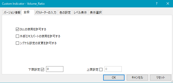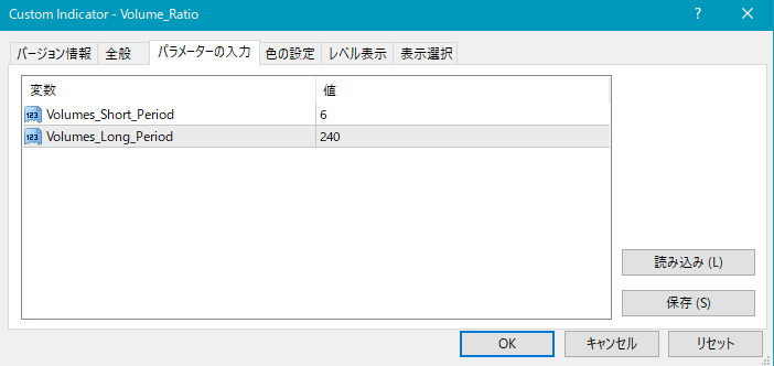 本商品には、ボリューム平均比(短期ボリューム平均/長期ボリューム平均)を表示するインジケーター Volume_Ratio_XXXXXXXX.ex4 が付属しています。 チャート例 サブウィンドウ:Volume_Ratio 設定項目について  下図の通り、"DLLの使用を許可する" にチェックを入れる必要があります。 Volumes_Long_Period:  長期ボリューム平均の期間を設定します。 Volumes_Short_Period:  短期ボリューム平均の期間を設定します。