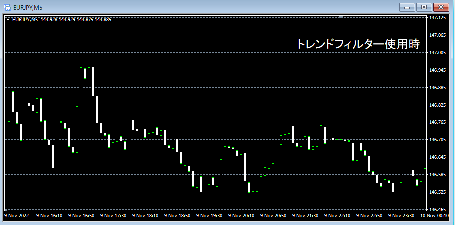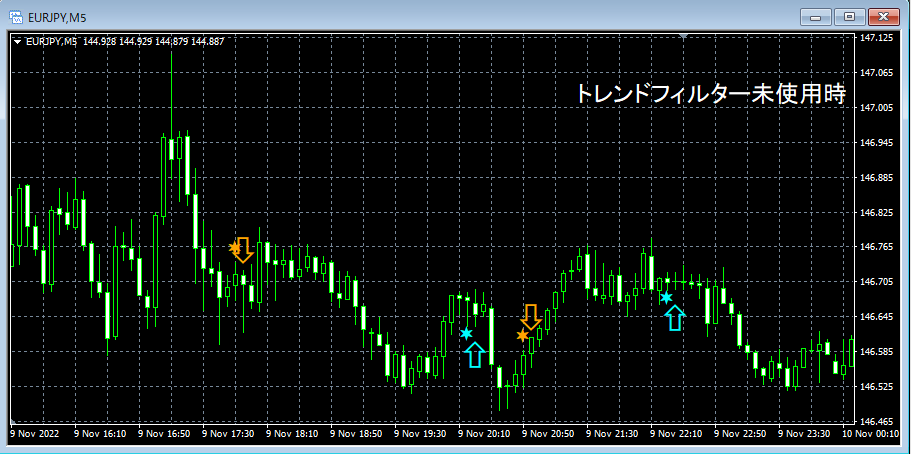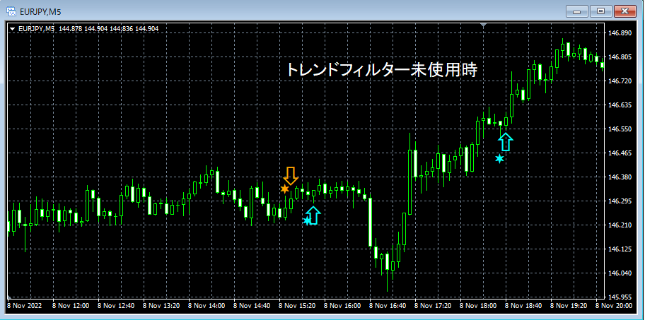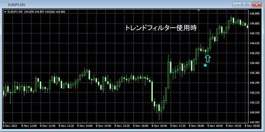 本体インジケーター【SRF2】には、トレンド系インジケーターによりトレンドの強弱を判定してサインの取捨選択を行うトレンドフィルターが実装されています。  上図の項目がトレンドフィルターの設定項目となっています。 Trend_Filter:  トレンドフィルターを使用する場合には true、使用しない場合には false を選択する。 チャート例 トレンドフィルターなし (Trend_Filter = false) トレンドフィルターあり (Trend_Filter = true) トレンドフィルターなし (Trend_Filter = false) トレンドフィルターあり (Trend_Filter = true)