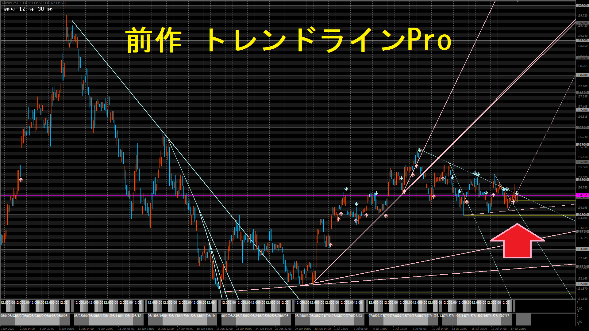 今見ても、『トレンドラインPro』のライン描画は、綺麗で分かりやすいです。 ラウンドナンバー(134.00)に引かれたラインで、『レジサポ転換』の様子も伺えます。 『レジサポ転換』後は、上への反発、次の押し目で、トレンドラインの反発(3接点目)から強く上げています。