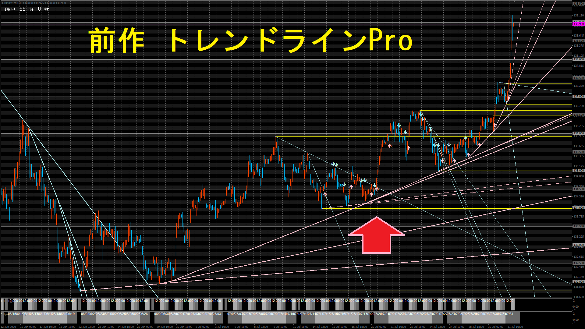 前作と今作の主な違いは、 『ライン』の精度に直結する『トレンド』認識が、【完全】へと進化した点で、そこに伴い、『サイン』と『ライン』の精度が、引き上げられている点です。 実際のチャートを例に見てみましょう。 まずは前作『トレンドラインPro』からです。 ◆トレンドラインPro◆ 桃色の↑= 最小の上げトレンド 水色の↓= 最小の下げトレンド [1枚目]