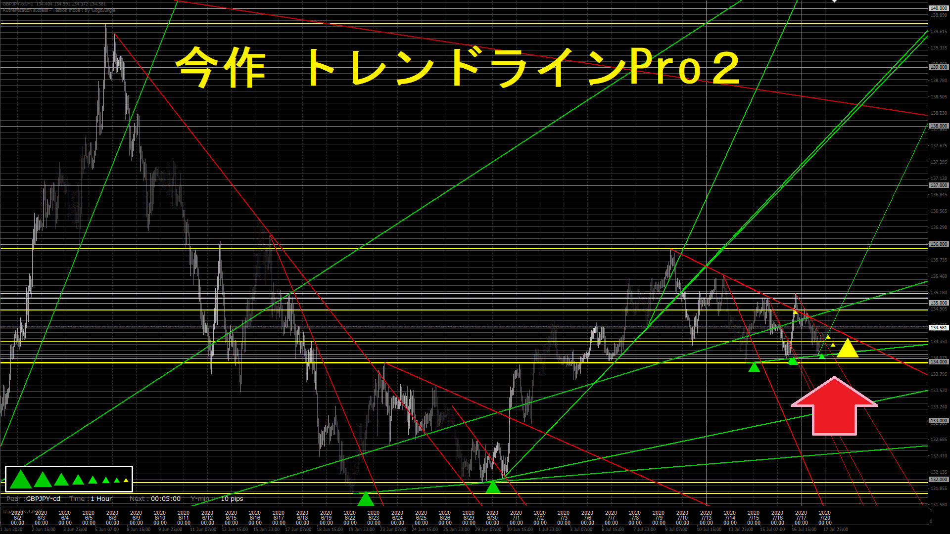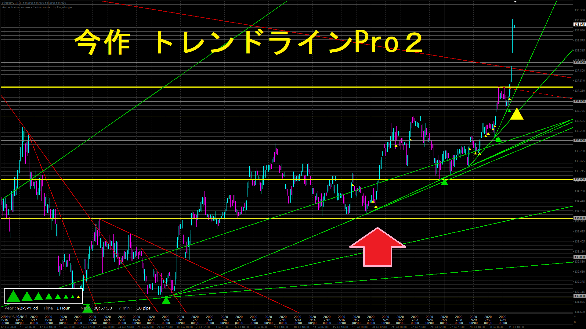 では、次に、今作『トレンドラインPro2』を見てみましょう。先程と同じ場面です。 ◆トレンドラインPro2◆ 緑色の▲= 上げトレンド 白色の■= レンジ(トレンドレス) 赤色の▼= 下げトレンド 黄色の▲= 5つ以上の▲が揃う 黄色の▼= 5つ以上の▼が揃う [1枚目]