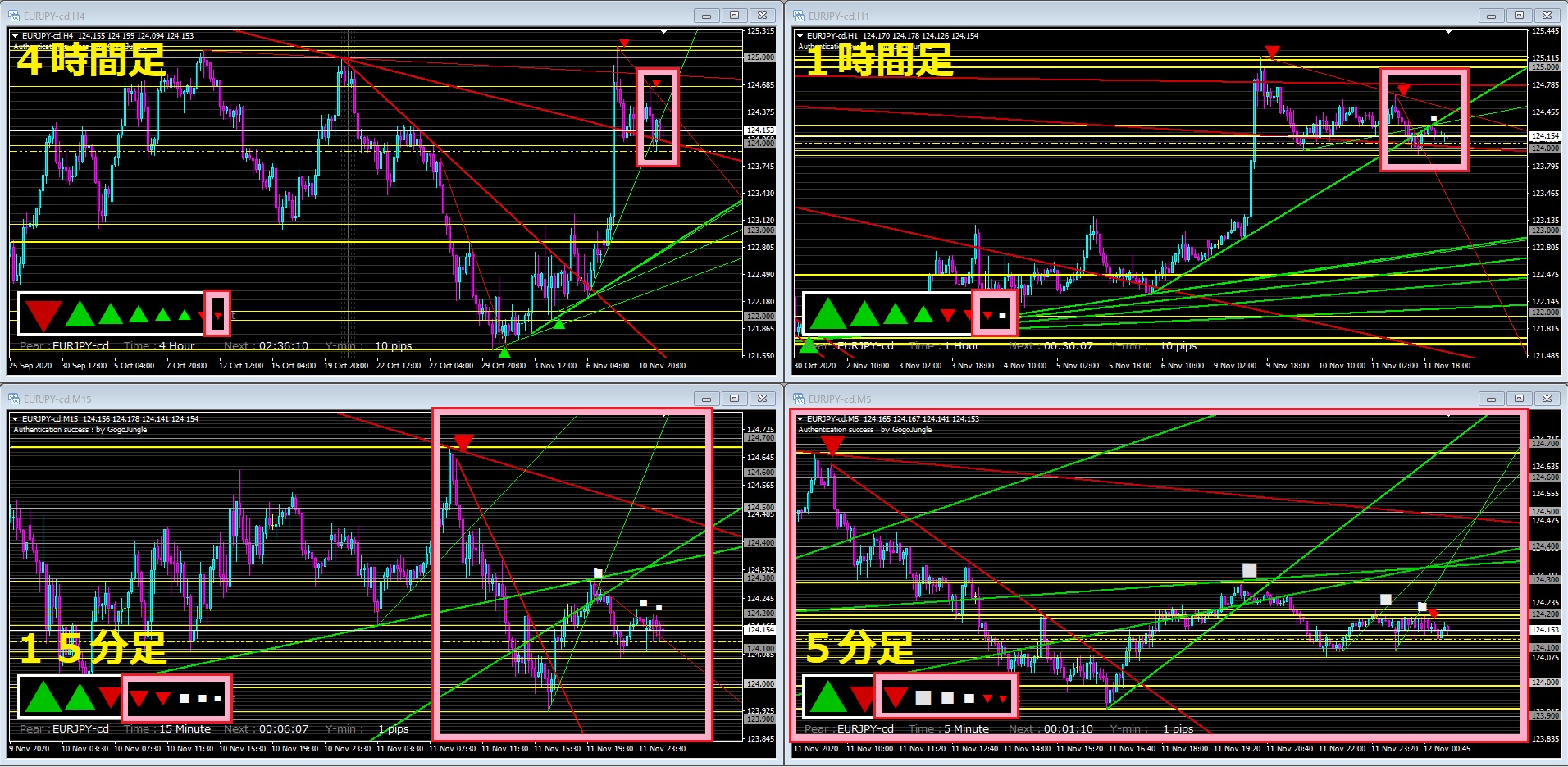 こちらでは、黄色のサポレジラインがしっかりと引かれ、先程より『レジサポ転換』の様子が非常に分かりやすいです。 『レジサポ転換』後は、上への反発、次の押し目で、トレンドラインの反発(3接点目)から強く上げています。 緑色の▲記号のサインに加え、黄色の▲記号のサインも出現しており、トレンドに逆らわないトレードの徹底がしやすいので、損小利大の力強いサポートとなります。 [トレンドラインPro2 各時間足並列]