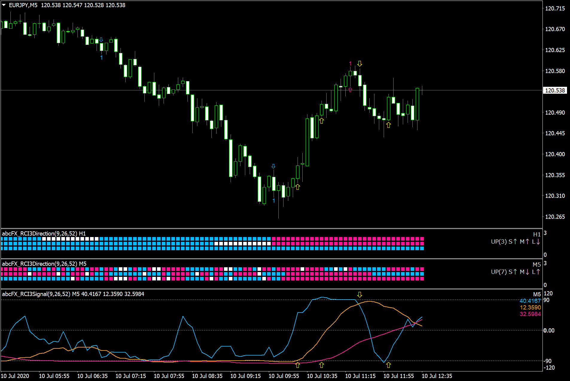 3本のRCI(Rank Correlation Index)を使用して、各RCIの方向をサブウィンドウに表示するMT4インジケーターです。