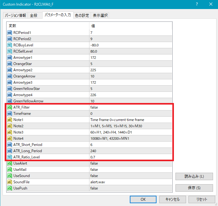 本商品には、ATR比(短期ATR/長期ATR)を表示するインジケーター MTF_ATR_Ratio_XXXXXXXX.ex4 が付属しています。 チャート例 サブウィンドウ:MTF_ATR_Ratio 設定項目について  下図の通り、"DLLの使用を許可する" にチェックを入れる必要があります。  本インジケーターは、MTF(マルチタイムフレーム)に対応しています。 TimeFrame:  表示するATR比を計算するタイムフレームを設定します。  現在のタイムフレームあるいはそれより上位の足(長期の足)を指定することができます。  現在のタイムフレームより下位の足(短期の足)を指定した場合は現在のタイムフレームを指定したことと同じことになります。  上図のNote1~Note4にあるように、TimeFrameの設定項目で指定できる値とタイムフレームとの対応は下記の通りです。例えば、1時間足を指定したい場合には60と入力します。   現在の足: 0   1分足:   1   5分足:   5   15分足:  15   30分足:  30   1時間足: 60   4時間足: 240   日足:  1440   週足: 10080   月足: 43200 ATR_Long_Period:  長期ATRの期間を設定します。 ATR_Short_Period:  短期ATRの期間を設定します。