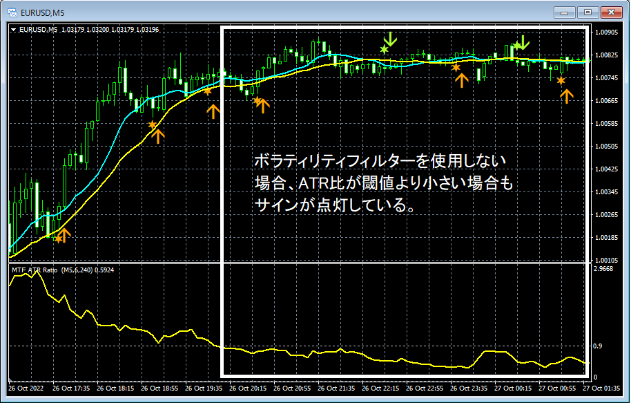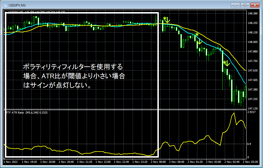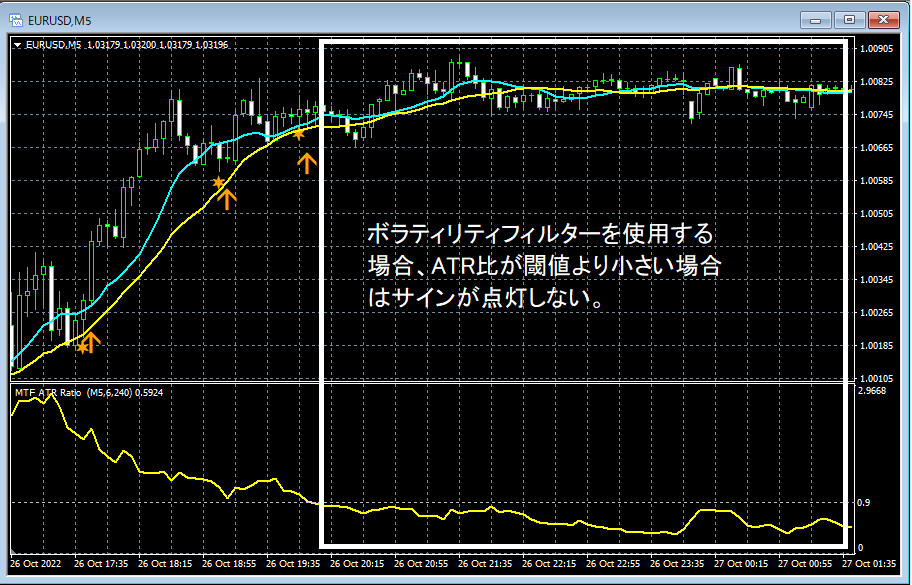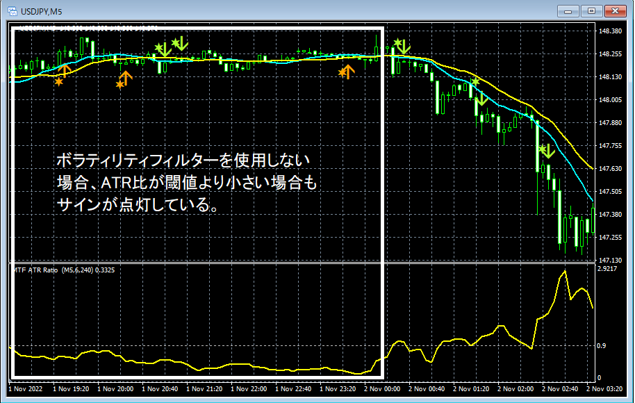 本商品に含まれる矢印インジケーターについては、ボラティリティ(値動き)の小さな相場を避けることを目的として、ATR比を使ったマルチタイムフレーム対応のボラティリティフィルターが実装されています。  ボラティリティフィルターを利用する場合、ATR比が指定した閾値(ATR_Ratio_Level)より大きい場合のみサインが点灯します。  ATR比短期ATR/長期ATR で定義される値です。  上図で赤い枠で囲った項目がATR比を使ったボラティリティフィルターの設定項目となっています。  MTF(マルチタイムフレーム)に対応しています。 ATR_Filter:  ボラティリティフィルターを使用する場合には true、使用しない場合には false を選択する。 TimeFrame:  フィルターに使うATR比を計算するタイムフレームを設定します。  現在のタイムフレームと同じタイムフレームあるいはそれより上位の足(長期の足)を指定することができます。  現在のタイムフレームより下位の足(短期の足)を指定した場合は現在のタイムフレームを指定したことと同じことになります。  上図のNote1~Note4にあるように、TimeFrameの設定項目で指定できる値とタイムフレームとの対応は下記の通りです。例えば、1時間足を指定したい場合には60と入力します。   現在の足: 0   1分足:   1   5分足:   5   15分足:  15   30分足:  30   1時間足: 60   4時間足: 240   日足:  1440   週足: 10080   月足: 43200 ATR_Long_Period:  長期ATRの期間を設定します。 ATR_Short_Period:  短期ATRの期間を設定します。 ATR_Ratio_Level:  ATR比が指定した閾値(ATR_Ratio_Level)より大きい場合のみサインが点灯します。 上記の各設定項目における設定値については、ユーザ様それぞれの手法,通貨ペアやタイムフレーム,その時々における相場状況などに応じてお好みの設定でご利用下さい。 チャート例 ボラティリティフィルターなし (ATR_Filter = false) ボラティリティフィルターあり (ATR_Filter = true, TimeFrame = 0, ATR_Long_Period = 240, ATR_Short_Period = 6, ATR_Ratio_Level = 0.9) ボラティリティフィルターなし (ATR_Filter = false) ボラティリティフィルターあり (ATR_Filter = true, TimeFrame = 0, ATR_Long_Period = 240, ATR_Short_Period = 6, ATR_Ratio_Level = 0.9)