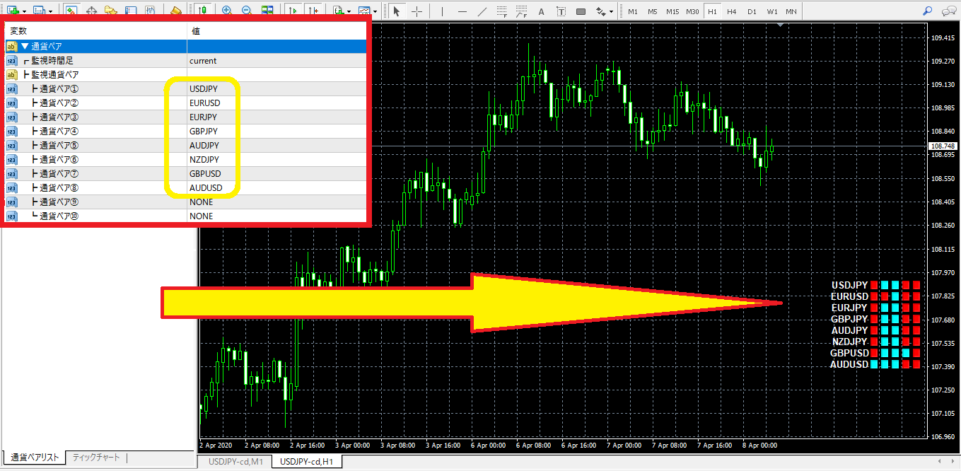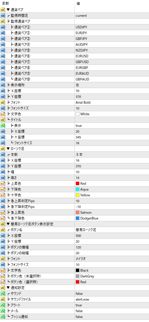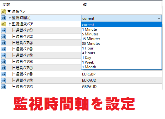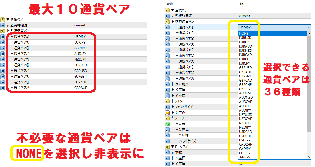 ②監視時間足:選択された時間足を用意されている36種類の通貨ペアリストから最大10通貨ペア選択可能
