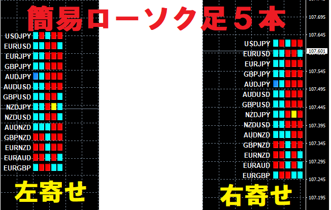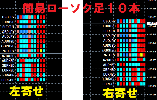 ①簡易ローソク足:各通貨ペアのローソク足の上昇か下降かだけを表示する(下図参考)