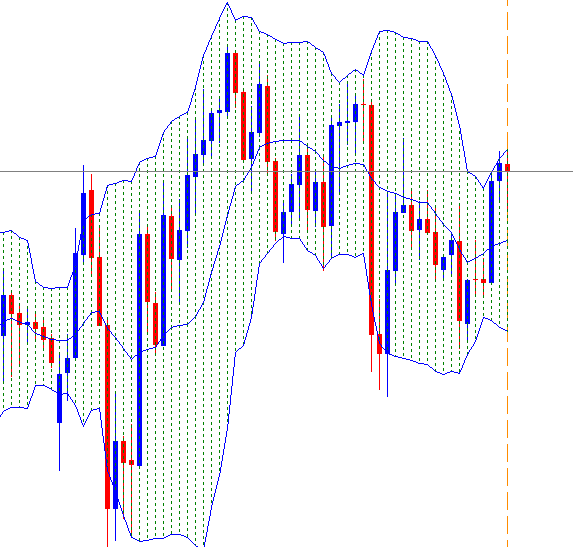 VT_Chartと同じチャートにインジケーターを導入すると、垂直線より右側が非表示のボリンジャーバンドが表示されます。 表示は確定足ベースで、下位足を動かしたときは1本前までを表示します。 コマ送りしたチャートでは垂直線まで表示されます。 割り当てたキーで表示のオン・オフが可能です。 またVT_Chartのオン・オフにも連動して、VT_Chartをオフにすると非表示になります