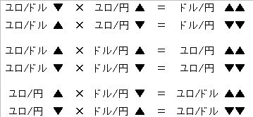 上図左側、2通貨ペアの値動き(▲・▼)が、上図右側、1通貨ペア(▲▲・▼▼)に乗っかります。
