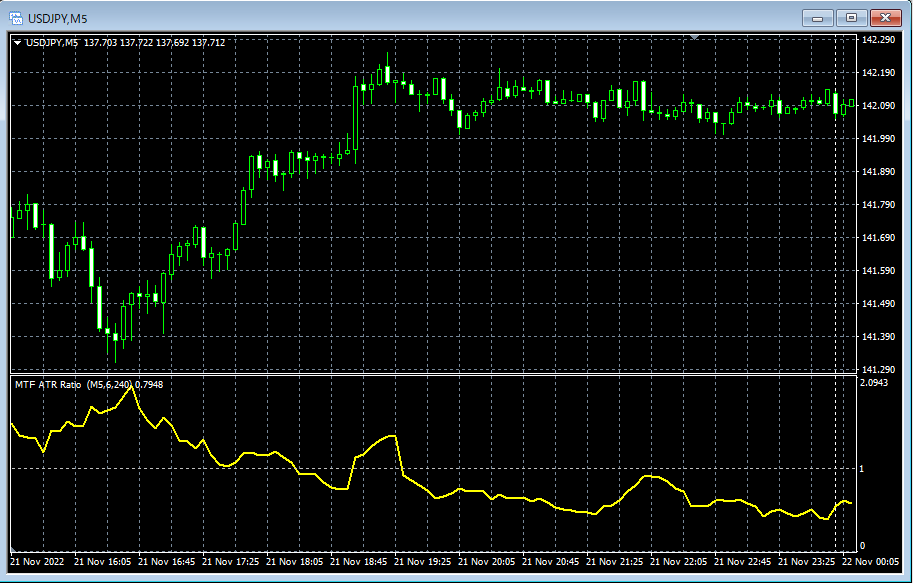 本商品には、ATR比(短期ATR/長期ATR)を表示するインジケーター MTF_ATR_Ratio_XXXXXXXX.ex4 が付属しています。
