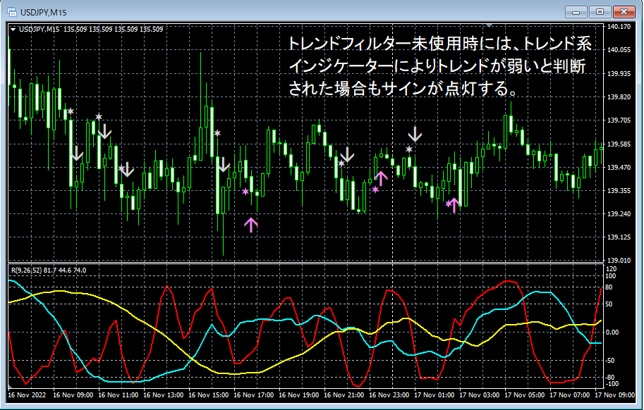本商品に含まれる矢印インジケーターについては、トレンド系インジケーターによりトレンドの強弱を判定してサインの取捨選択を行うトレンドフィルターが実装されています。