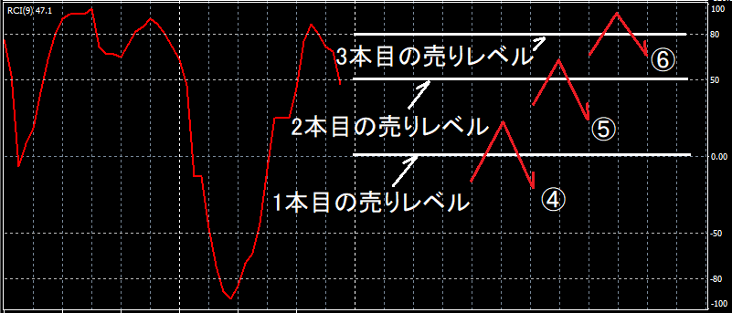 ④ RCIが OversoldLevel2 = 0 まで下げず、OversoldLevel1 = +50 を上抜けした時に、