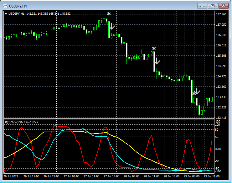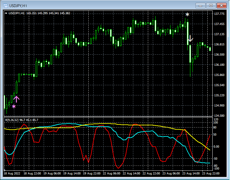チャートの例(ドル円1時間足,ユーロドル1時間足)を追加しました。本ページの下の方に「◆R1R2S3のサインの例 2022年10月9日追加」という新たな項目を設けて41枚のチャートを掲載しました。