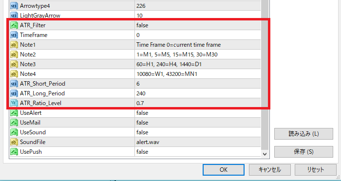 本商品に含まれる矢印インジケーターについては、ボラティリティ(値動き)の小さな相場を避けることを目的として、ATR比を使ったマルチタイムフレーム対応のボラティリティフィルターが実装されています。