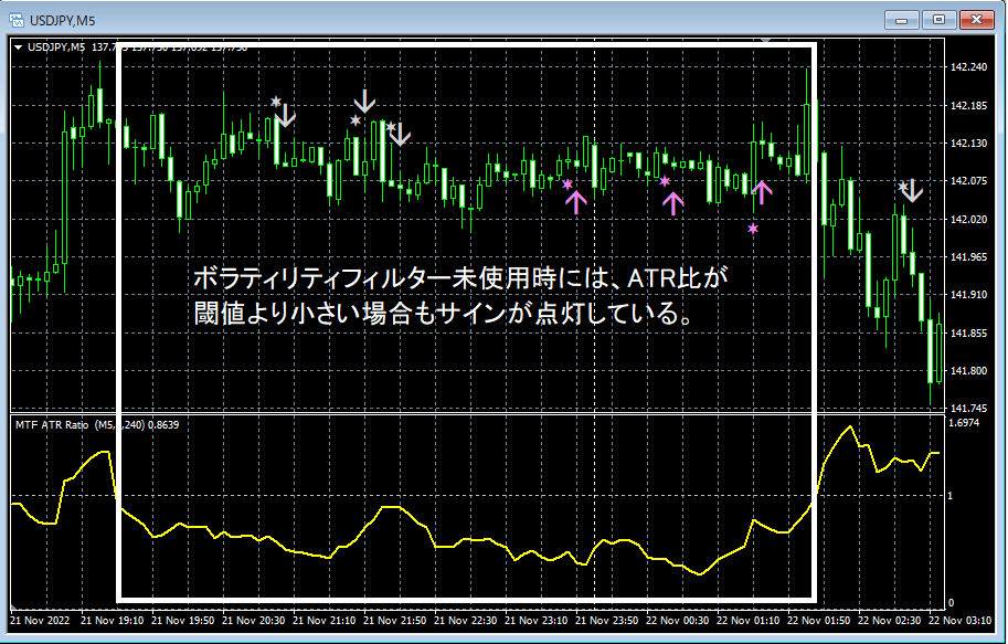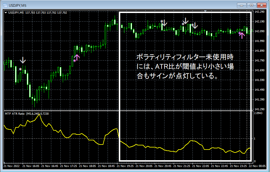 ボラティリティフィルターを利用する場合、ATR比が指定した閾値(ATR_Ratio_Level)より大きい場合のみサインが点灯します。