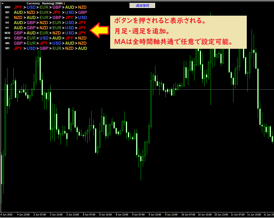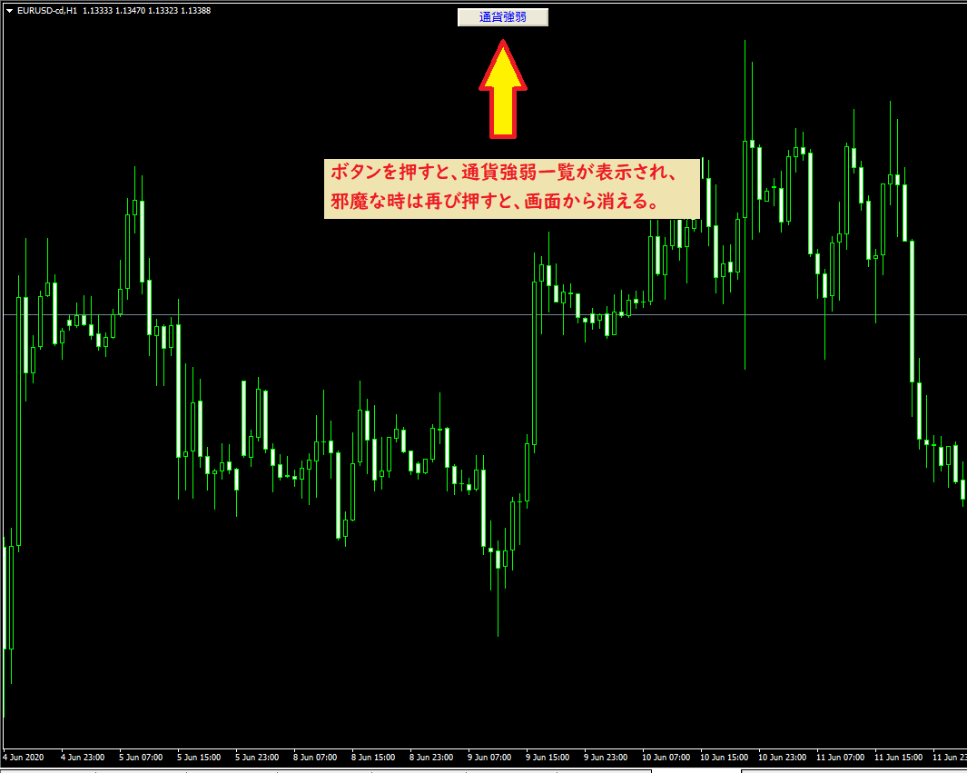 ⑥通貨強弱ボタン:表示・非表示がボタンの押下で可能です。(下図参考)