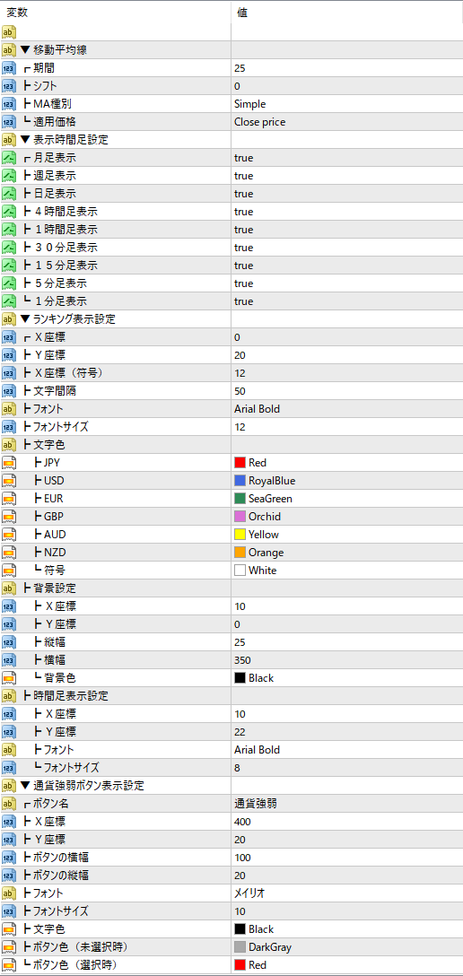 ①強弱判定基準:通貨ペア総当たりで移動平均線より価格が上か下で勝ち負けを決める