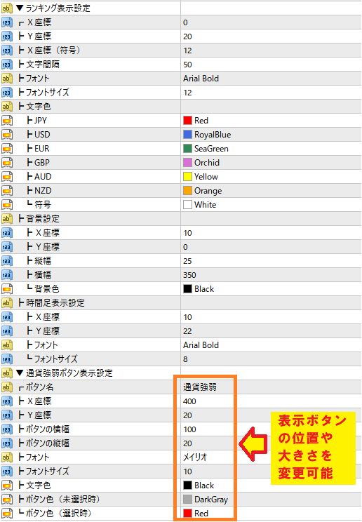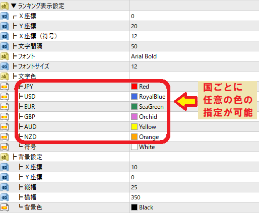 ④文字色・文字サイズ:通貨名の文字色や文字の大きさを設定