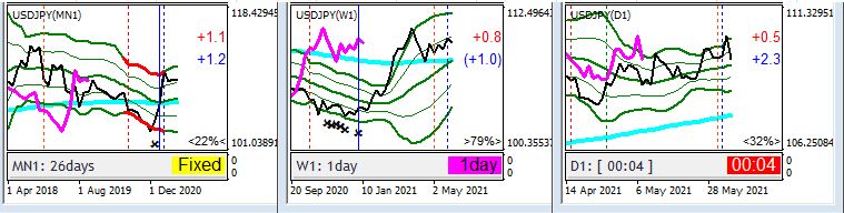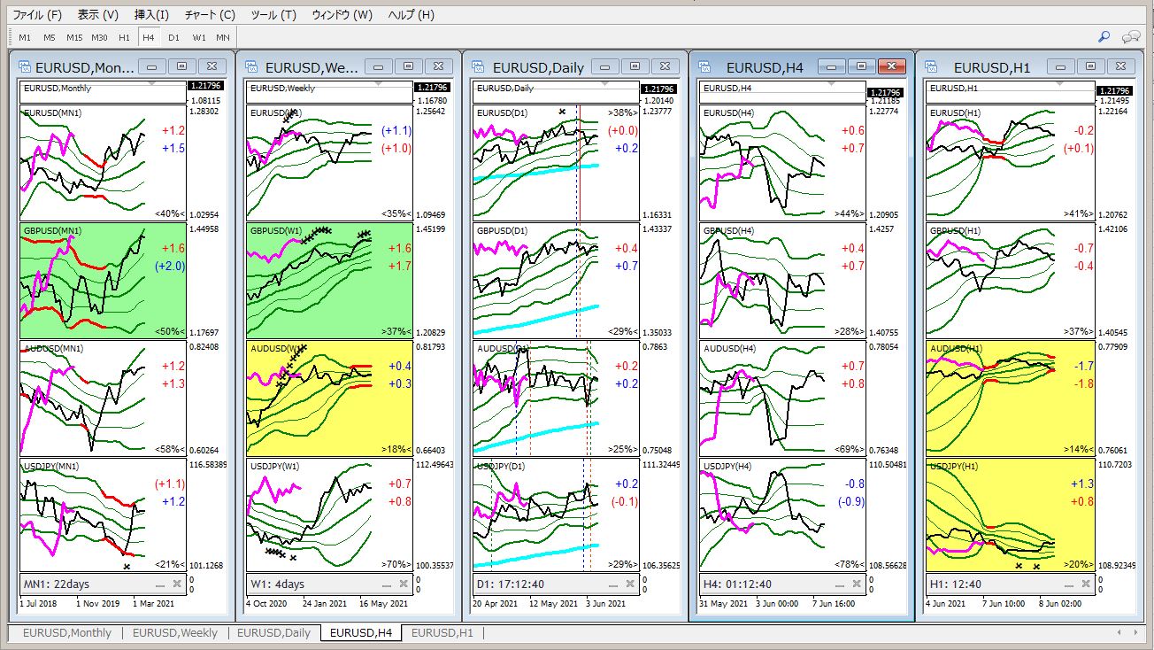 少し難しいので、読み飛ばして貰って良いですが、上のチャートで考えてみると、週足が5/29に+1.0σへの陽線を形成しており5/31~6/5の期間に頭を押さえて下げる可能性がある局面だと把握出来、日足は6/1に+1σへの陰線形成したので+2σ方向にバンドウォークする上げ下げの攻防に見える局面ですが、週足と日足のローソク足確定までの期間で考えると日足が上昇バンドウォーク後に週足で頭を押さえる値動きをしても十分間に合うことが事前に確認出来、そのような分析がチャートを見て出来るように終値に対応するσ値と残り時間と終値線・各バンドを表示しています。