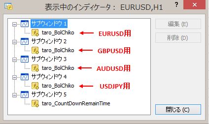 ・逆に表示する通貨ペアを増やしたい場合は、[表示中のインディケーター]画面で[taro_CountDownRemainTime]を削除後、[taro_BolChiko]を必要数分挿入&設定変更し最後に[taro_CountDownRemainTime]を挿入してください。