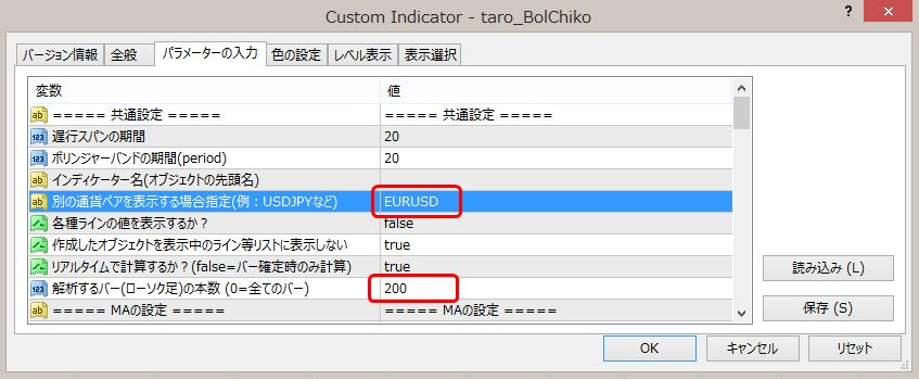 ●BolChikoの設定(変更する箇所):別の通貨ペア~、解析するバーの本数(200) (変更可能)