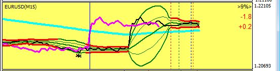 遅行スパンは通常はボリンジャーバンドの+2σと-2σの範囲から上下に飛び出すことはありませんが、ボリンジャーバンドがスクイーズしたあとにトレンドがでたり、強い値動きが出たときには遅行スパンが±2σを上下に飛び出します。 (昔、ボリ平さんのボリ平ドラゴン式のチャートをストラテジーテスターで動かしていたら遅行スパンがボリンジャーバンドから外に飛び出して心臓が止まるほどビックリしたことを思い出します。下のチャートは各通貨ペアの15分足でスクイーズ状態から遅行スパンがバンドを飛び出し、大きく値が動いたあと遅行スパンがバンド内に戻りスクイーズ状態になる例です。)