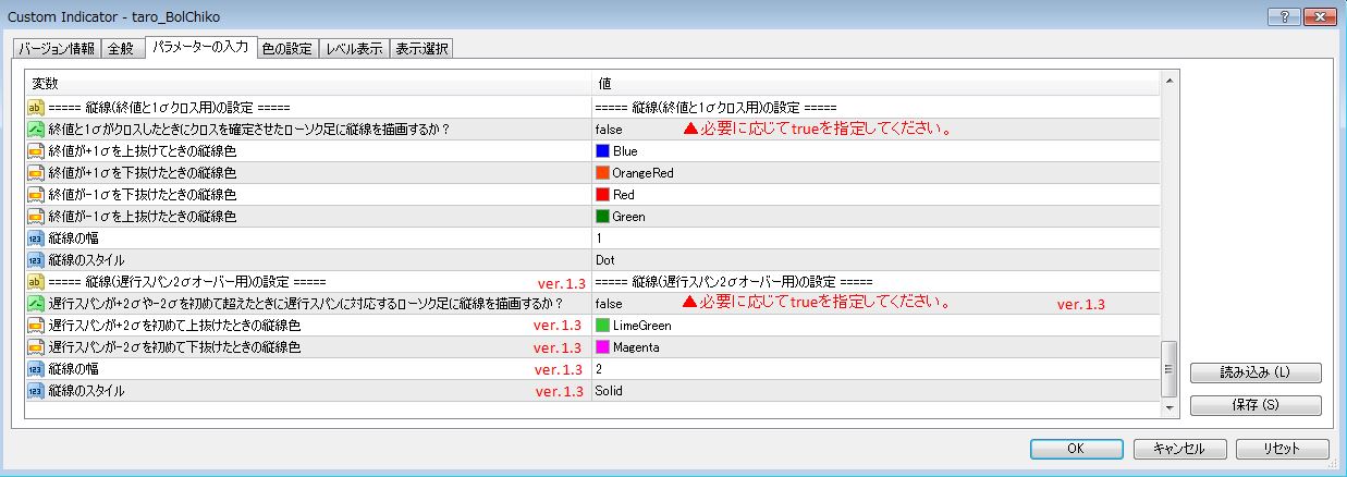 (2) 三重天井・三重底から終値が1σをクロスして抜け出るときの縦線の色をパラメーターで指定可能にしました。