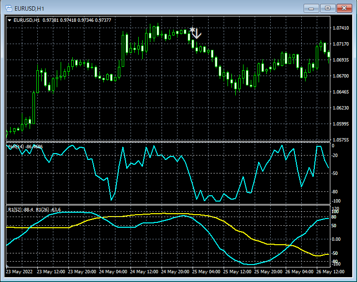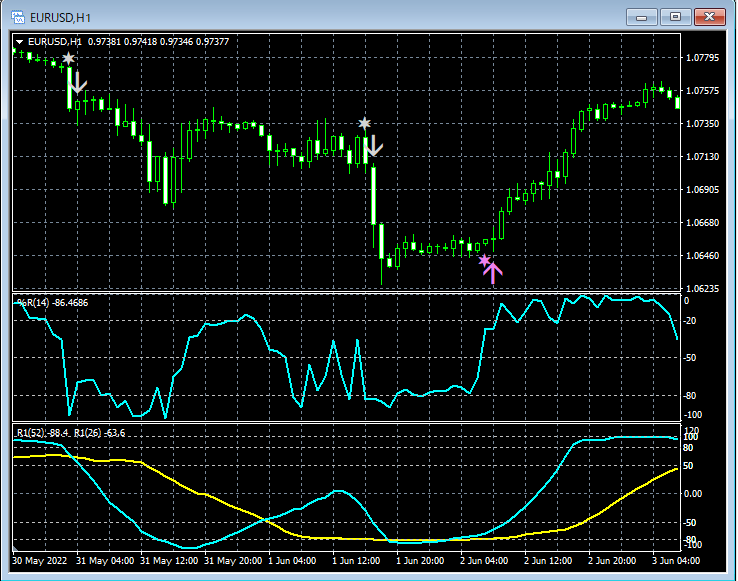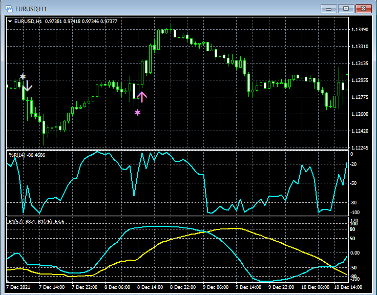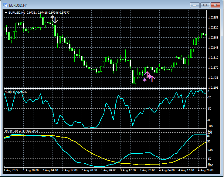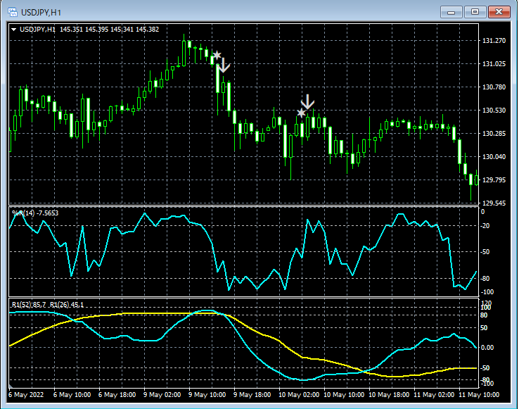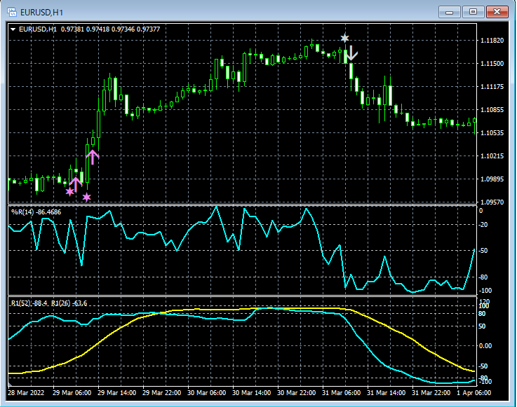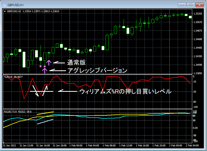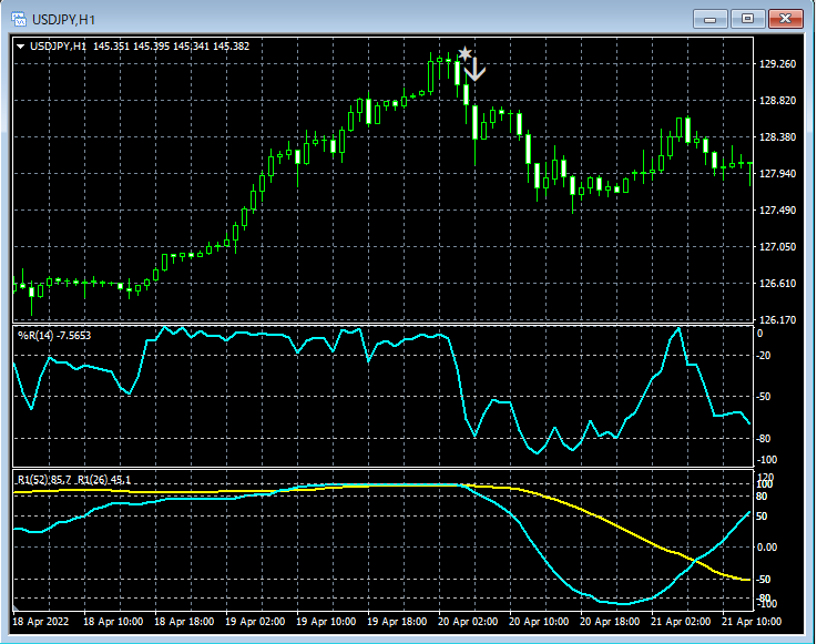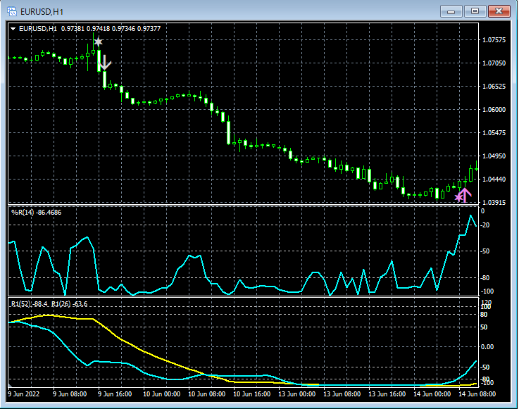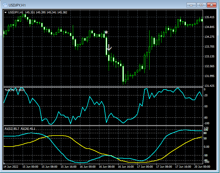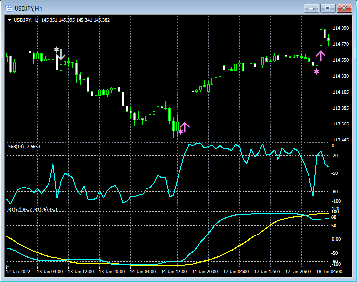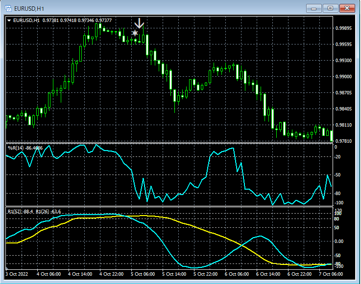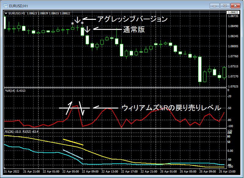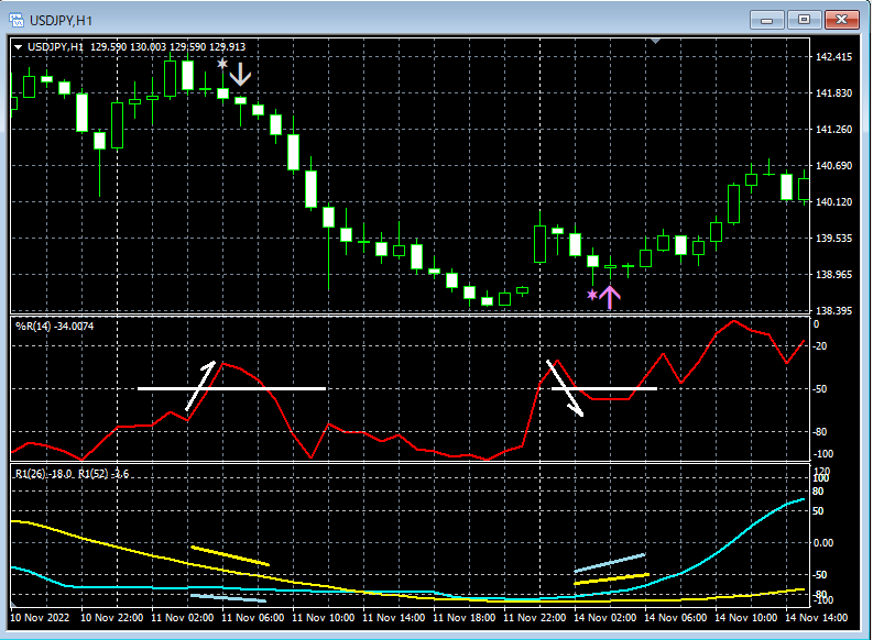 チャートの例(ドル円1時間足,ユーロドル1時間足)を増やしました。本ページの下の方に「◆R2WPRのサインの例 2022年10月8日追加」という新たな項目を設けて計16枚のチャートを掲載しました。