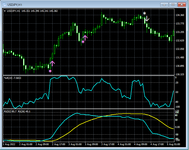 ウィリアムズ%Rが押し目買いレベルを下から上へ抜けたときに、2本のRCIが上向きならばバイオレット色の星印が点灯します。