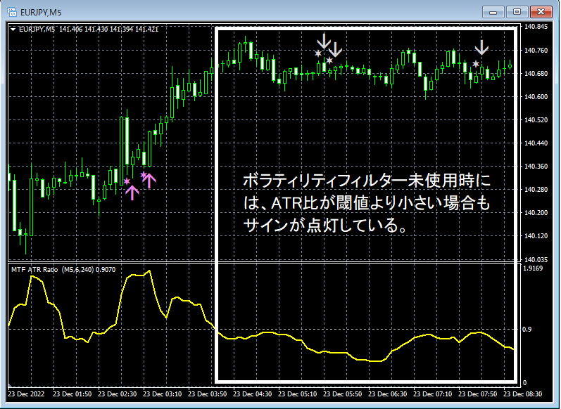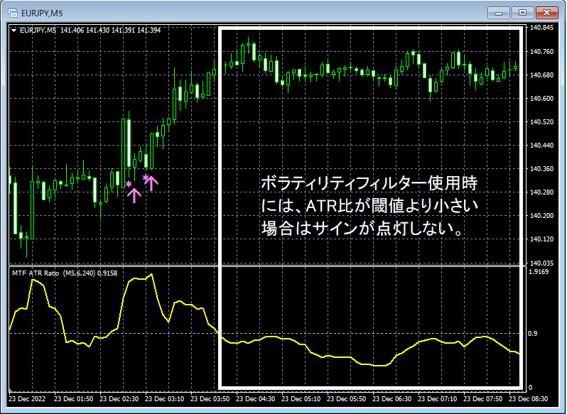 ボラティリティフィルターを利用する場合、ATR比が指定した閾値(ATR_Ratio_Level)より大きい場合のみサインが点灯します。