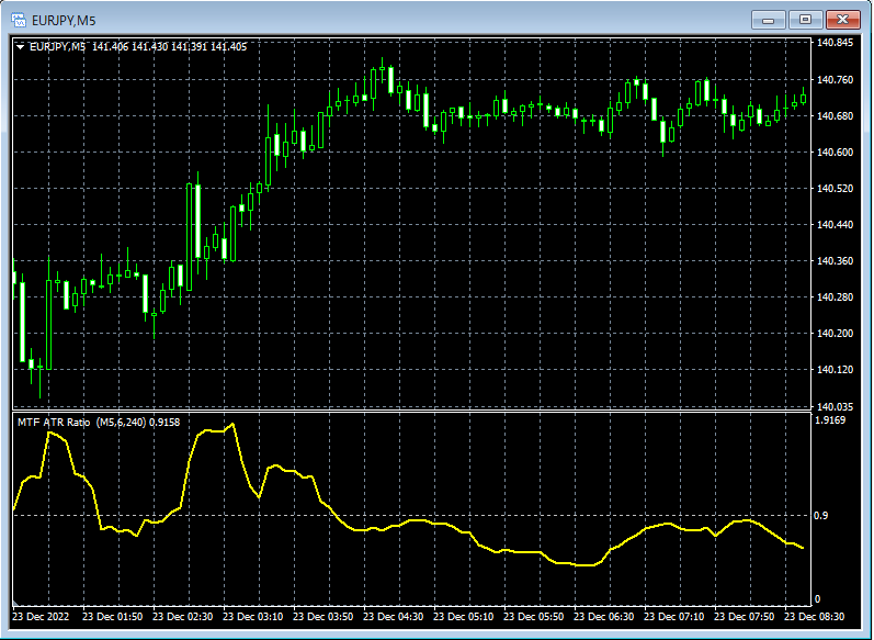 本商品には、ATR比(短期ATR/長期ATR)を表示するインジケーター MTF_ATR_Ratio_XXXXXXXX.ex4 が付属しています。