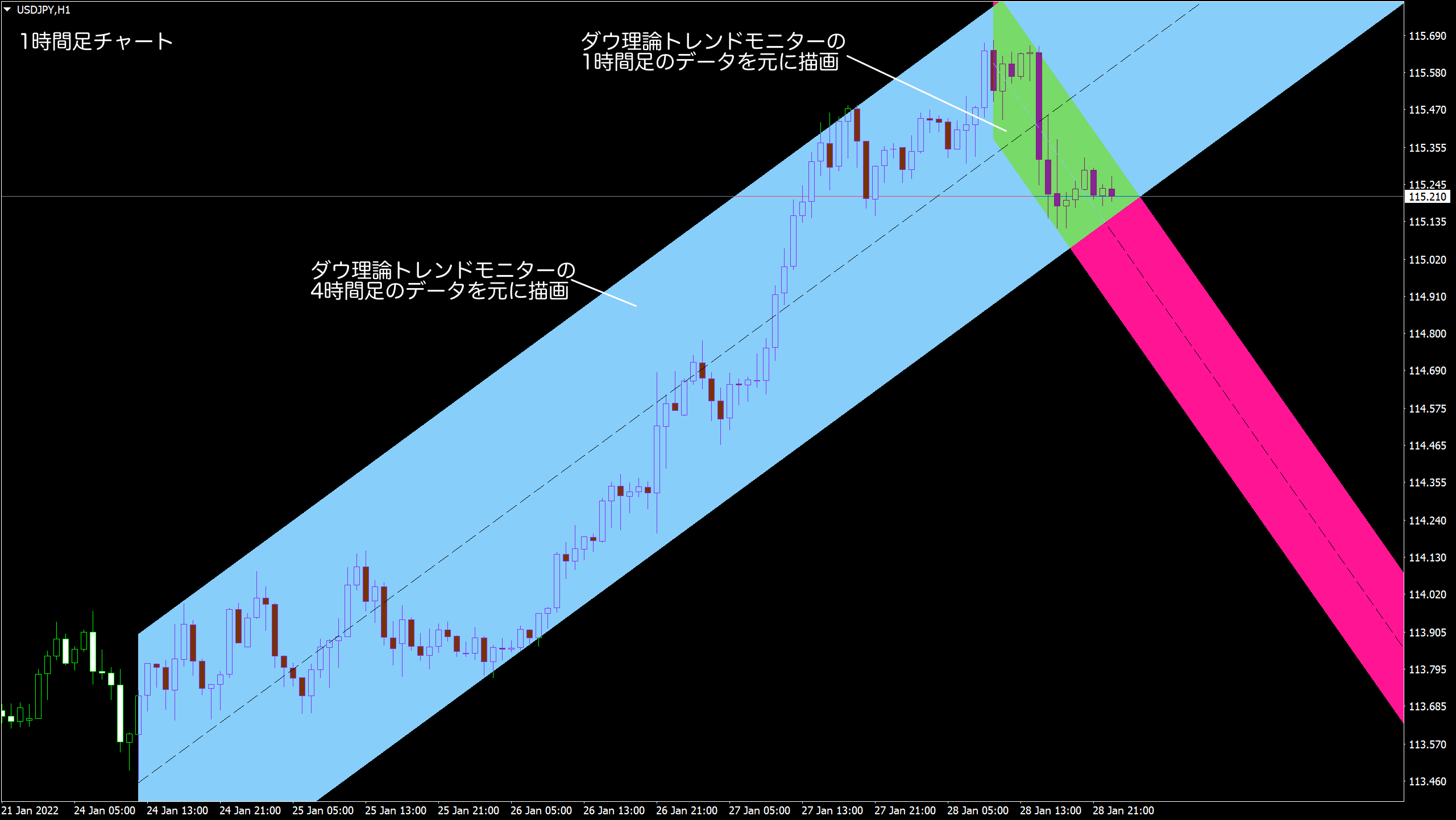 下図は、1時間足チャートに、1時間足の線形回帰チャネルと4時間足の線形回帰チャネルを表示しています。