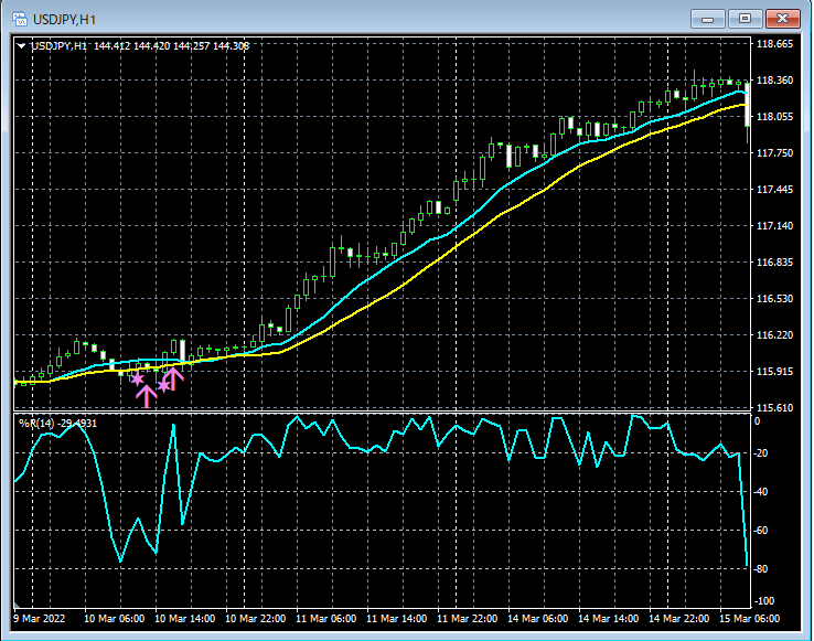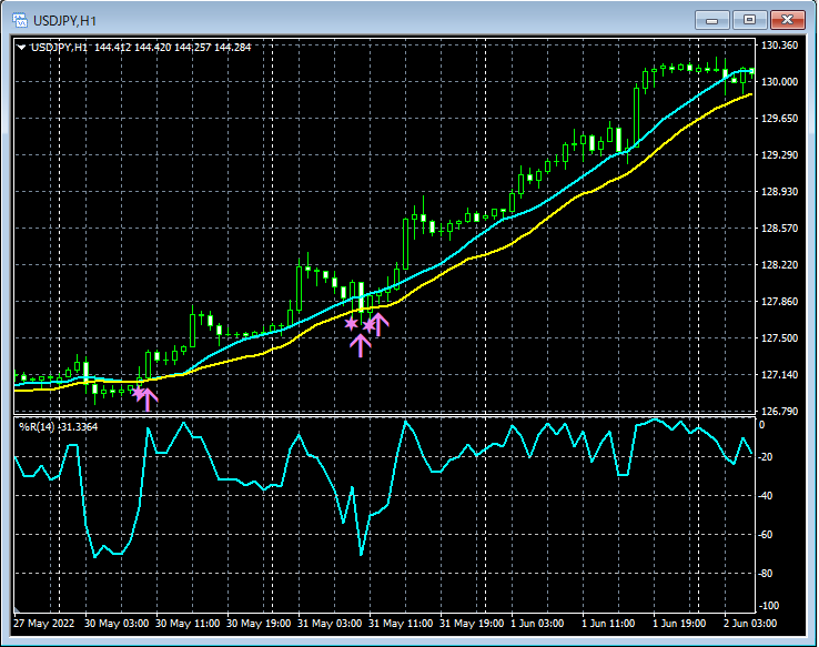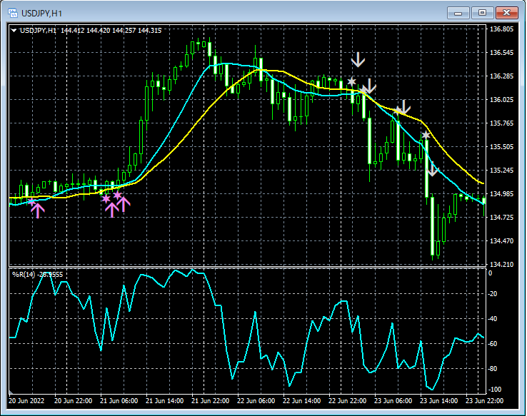 ウィリアムズ%Rが3段階判定により売られ過ぎラインを上抜けてきたと判定されたときに、2本の移動平均線の向きが上向きならばバイオレット色の星印が点灯します。