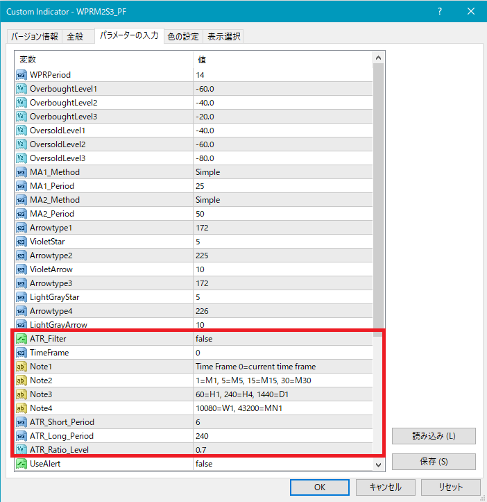 上図で赤い枠で囲った項目がATR比を使ったボラティリティフィルターの設定項目となっています。