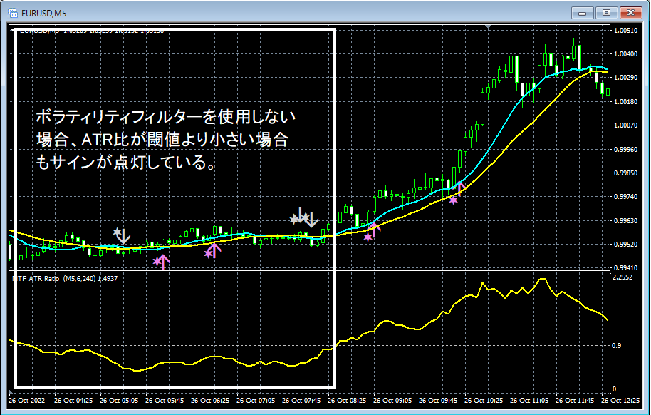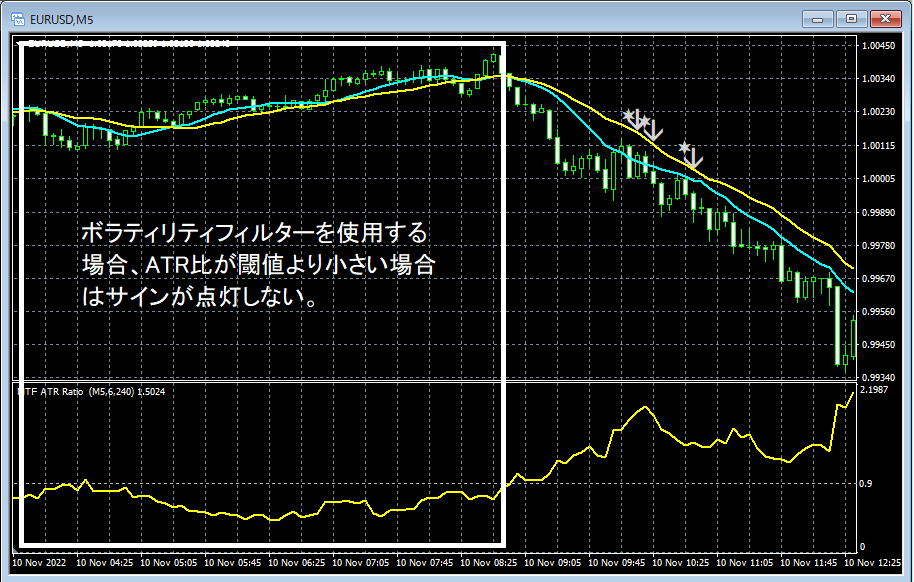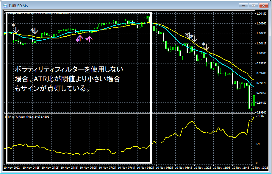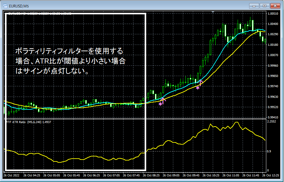 ボラティリティフィルターを利用する場合、ATR比が指定した閾値(ATR_Ratio_Level)より大きい場合のみサインが点灯します。