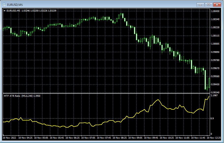 本商品には、ATR比(短期ATR/長期ATR)を表示するインジケーター MTF_ATR_Ratio_XXXXXXXX.ex4 が付属しています。