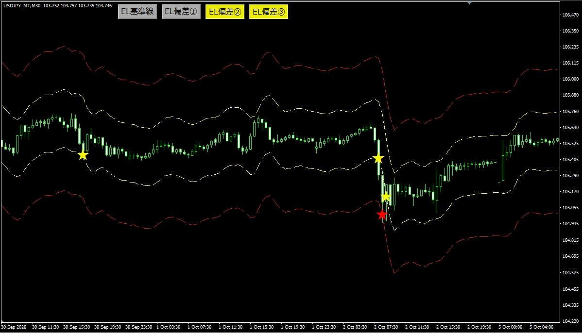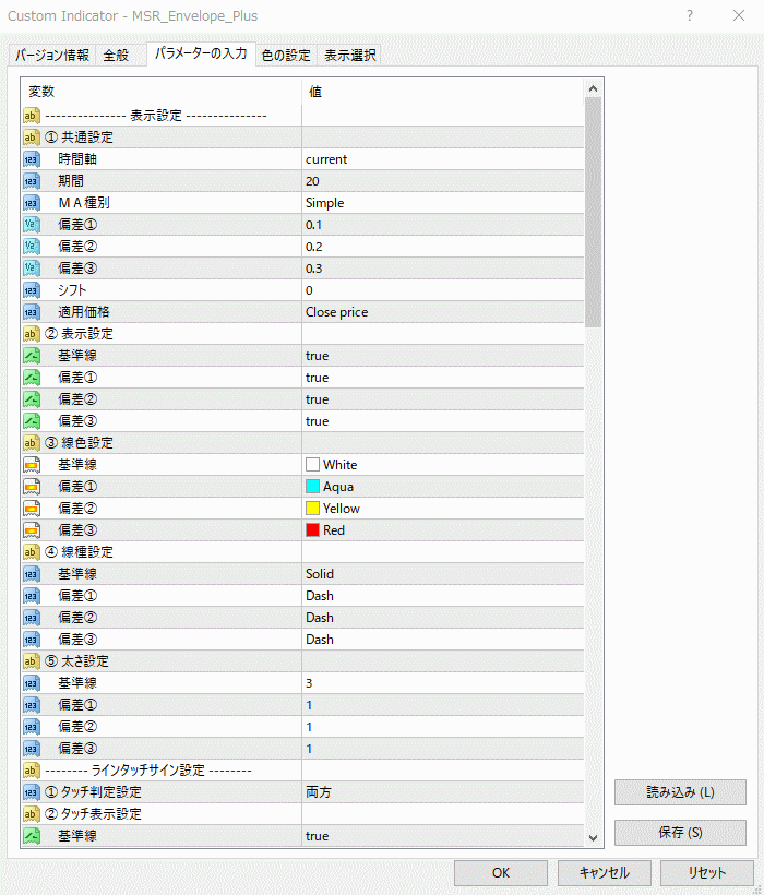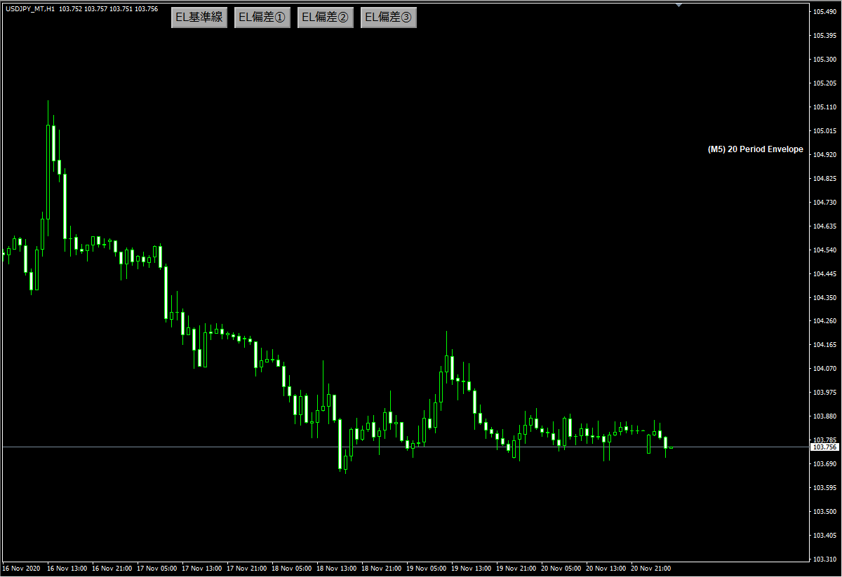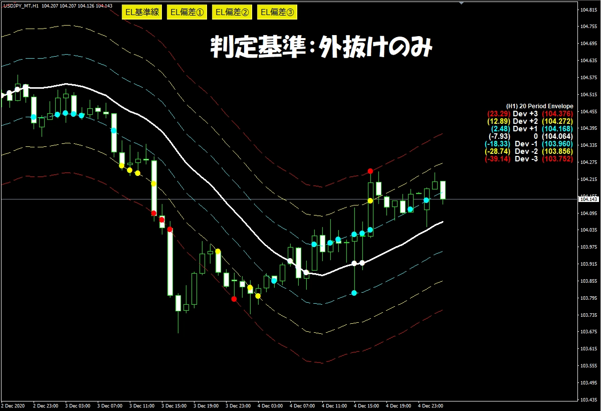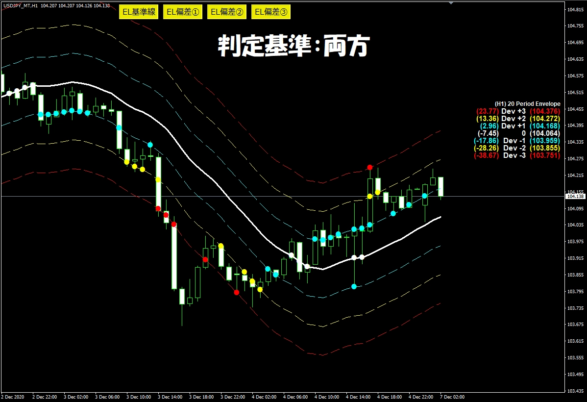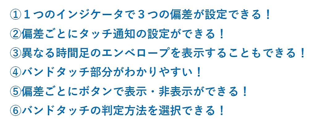 1つのインジケータで3つの偏差が設定できる! 異なる時間足のエンベロープを表示することもできる! 偏差ごとにボタンで表示・非表示ができる!もちろんアラート機能付き♪