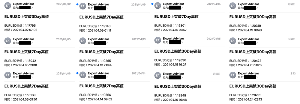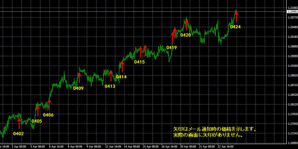 <取引価格の変動とメール送信記録> (EURUSD、2021年4月2日から4月24日)