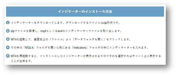 MT4ファイルメニューからデータフォルダを開き、MQL4フォルダの中に「indicators」というフォルダがあるのでそこにダウンロードしたファイルをコピーします。
