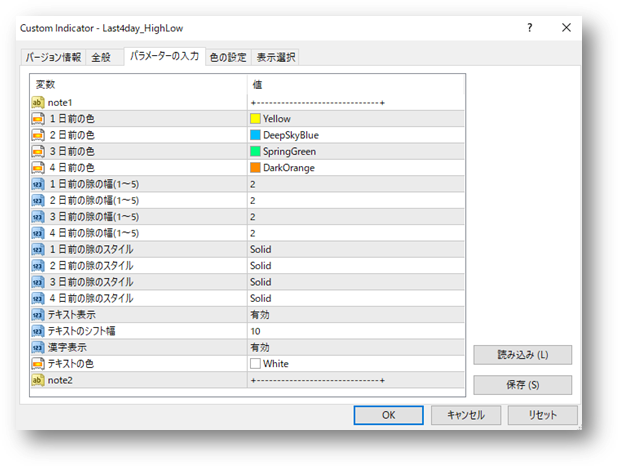 こんにちは、りえです。 ご覧頂きありがとうございます。(^▽^)/ 本インジケータは、エントリーをする上で投資家の意識している、深層心理を突いた価格帯(直近過去4日間の日足高値安値)を水平線で表示するインジケータです。