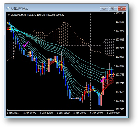 ネット上に【無料】でGMMAインジケータも沢山ダウンロード可能なサイトがありますが、プログラム言語が古かったりで、MT4のバージョンアップに今後も対応できるように最新のプログラム言語のバージョンで書き直したものです。