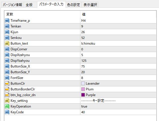 当インジケーターは、チャート内に表示させたボタンのクリック、またはキーボードの任意のキーを押下することにより、一目均衡表の表示を消したり、再度表示させたりすることができるインジケーターです。 また、当一目均衡表はMTF(マルチタイムフレーム)機能を有しています。 設定によって、例えば5分足チャートに15分足チャートや1時間足チャートの一目均衡表を表示させることができます。 ■設定項目また、こちらのインジケーターには、通常版と、チャート適用時にデフォルトで非表示となっているバージョンの2種類が同梱されています。お好みにより使い分けてください。 2021/09/07 MT5ベータ版(Ichimoku_MTF_Button_USDJPY.ex5)を追加しました。こちらは、レート配信がされていない場合(土日等)のみ、PCのスリープ復帰時に表示が消えます。チャートのタイムフレームを切り替えることにより再表示されます。(動作確認はMetaQuotes社のMT5デモアカウントで行っております。) ベータ版ではありますが、おまけとして商品に同梱させていただくことにしました。 既にMT4版のみをご購入いただいているお客様で、MT5版をご利用いただく場合は、ダウンロードページより再ダウンロードをお願いいたします。