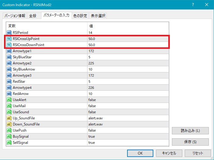 RSI50Mod2_XXXXXXXXX.ex4の場合には、下記の設定項目でRSIのアラートラインを任意の値に設定することが可能です。