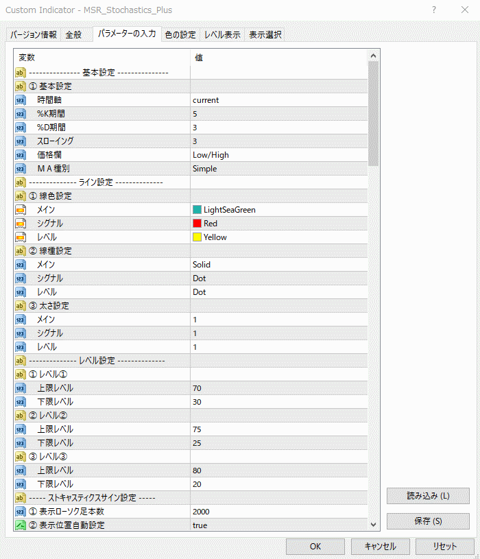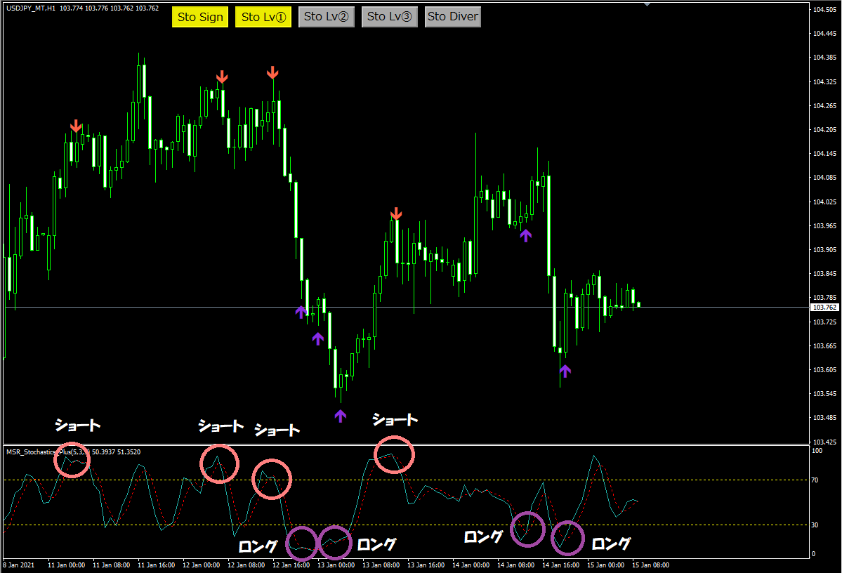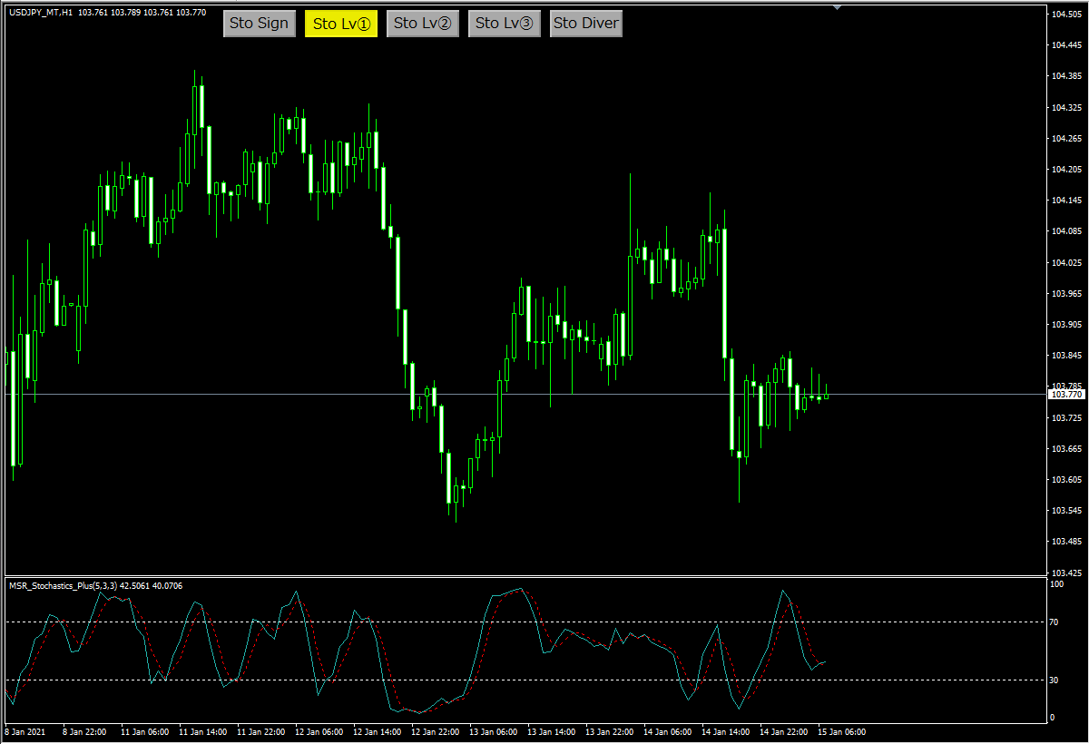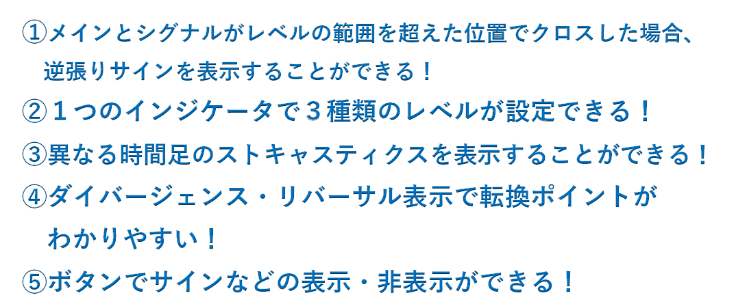 レベルの範囲を超えた位置でクロスをすると逆張りサインを表示します!3種類のレベルを設定でき、異なる時間足のストキャスを表示することも可能!ダイバージェンス・リバーサル判定で反転を先読み!